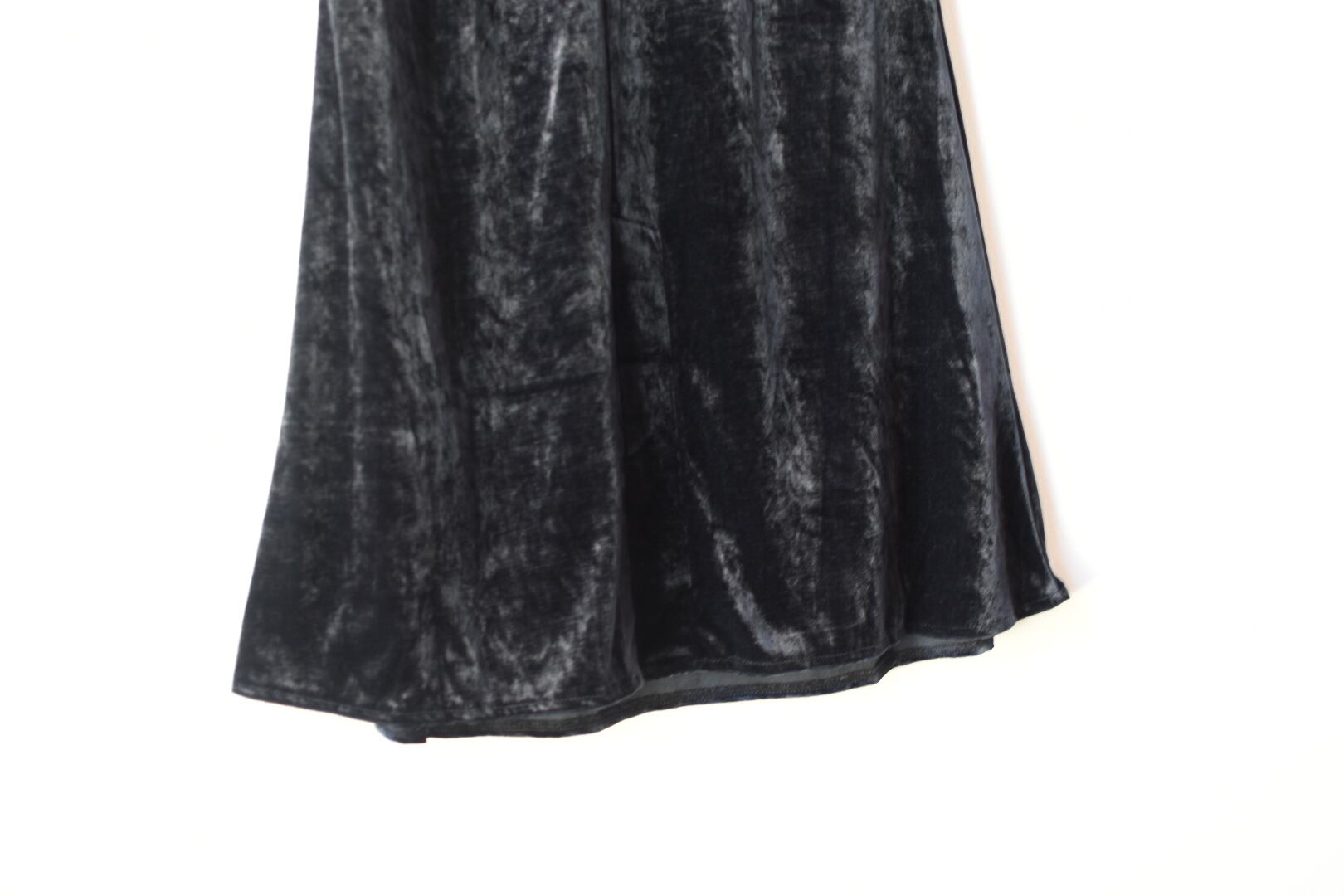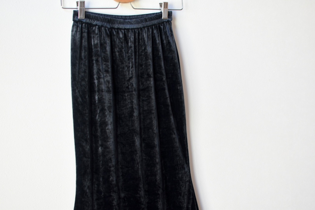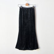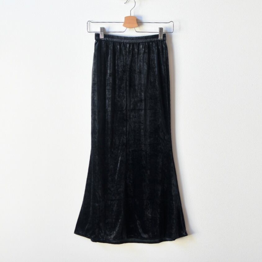 イエナのベルベットマーメイドスカートです。光沢があり、光の当たり具合で表情が変わる様はエレガントな印象を与えてくれます。また、シックなブラックなので、さまざまななトップスの合わせやすいので、日々のスタイリングに役立ちます。